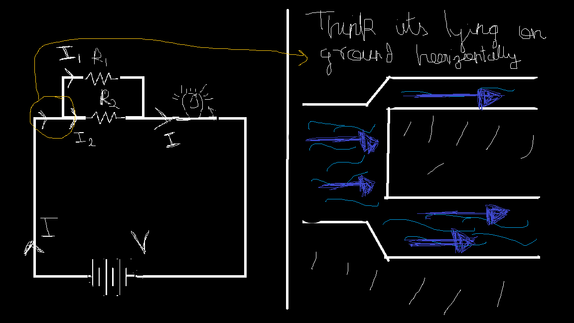Back to the water analogy—imagine the pressure near the mouths of two different pipes. Would it vary? Why, you ask? Since the same amount of water is flowing through both, think of each pipe individually: