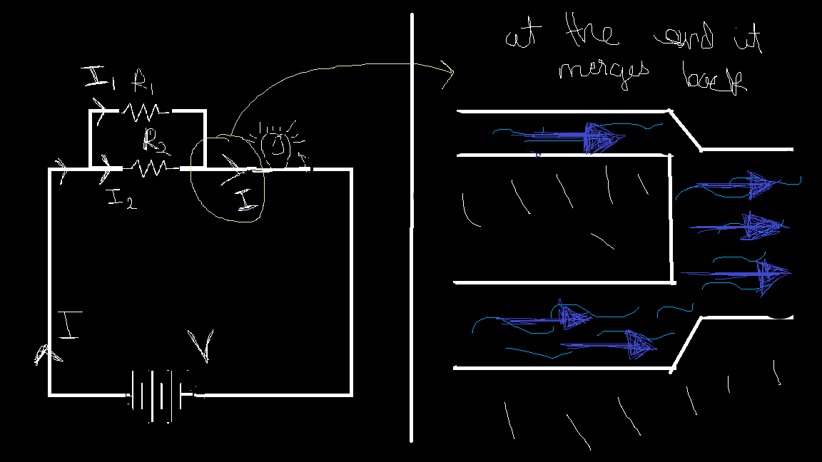So now the two resistors are in different paths we see. The thing here to notice is that “they are connected end to end and hence are said to be connected in parallel”. Hmm, What happens now?
