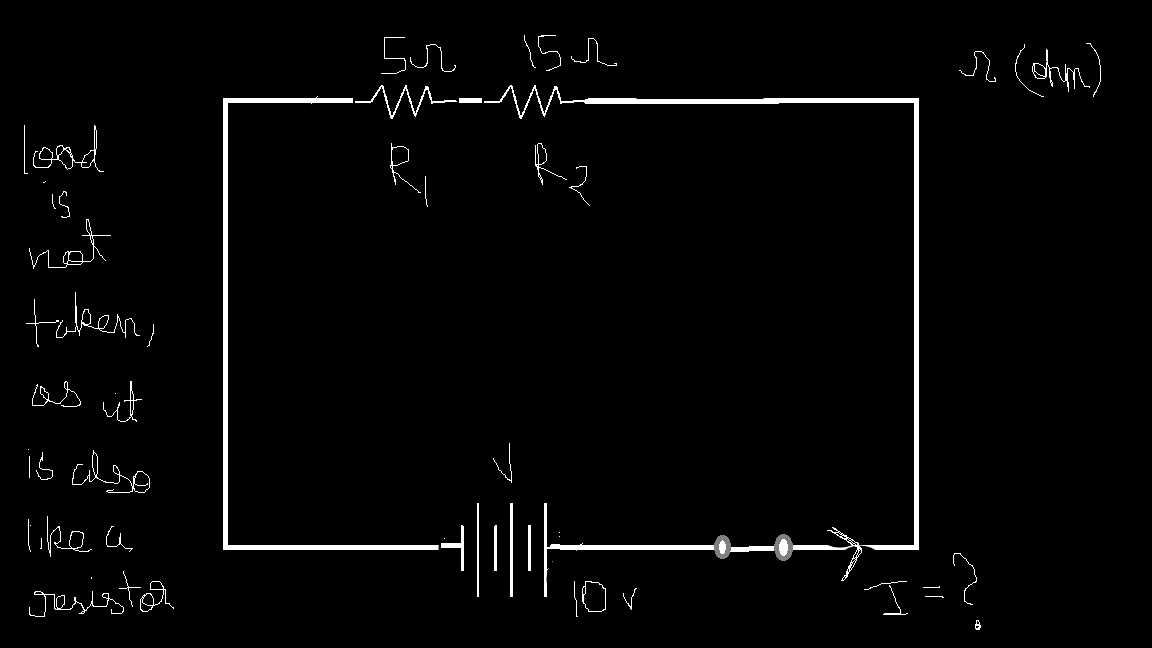 Simple? Now, let’s go further. Imagine there are two resistors in the circuit, placed one after the other. What happens now? We still know \(V\), but what about \(R\)? Will the total resistance be equal to \(R_{1}\), \(R_{2}\), their product, or their sum?