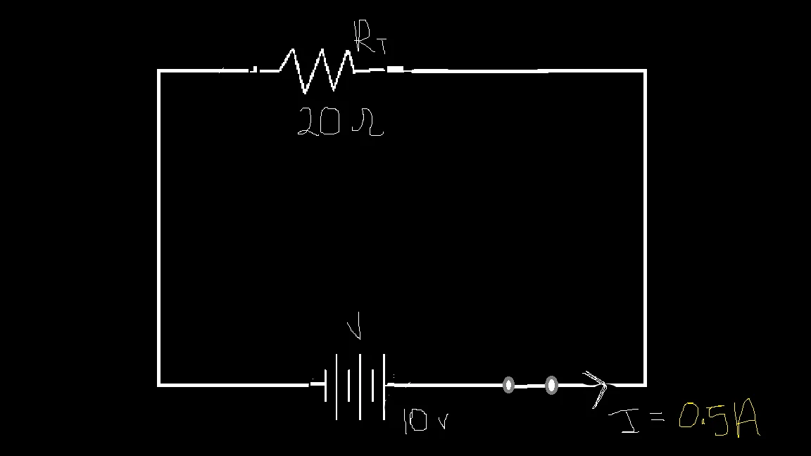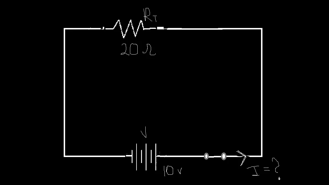 Step 3. Using \(V=IR\) total, We get \(I=\frac{V}{R_{total}}=\frac{10}{20}=0.5A\)