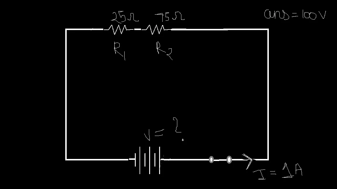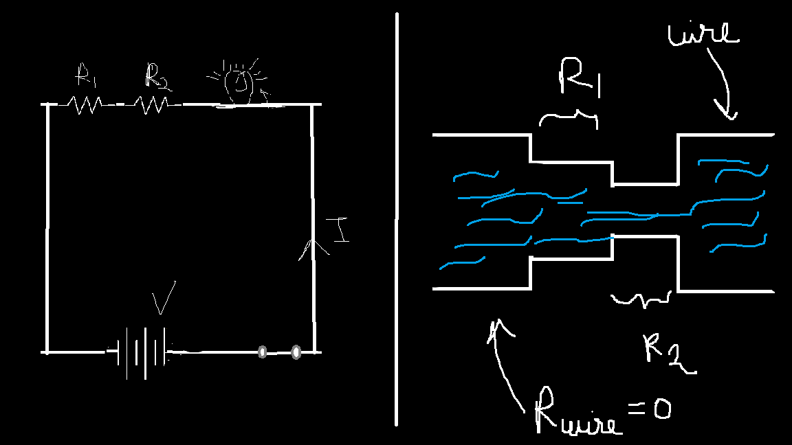 Similarly, in an electric circuit, the voltage across each resistor depends on its resistance. (Did this sparks some deep questions—we’ll cover them up in future articles:) Now, the sum of these two voltages is equal to the total voltage applied by the battery. \(V_{1}+V_{2}=V\)