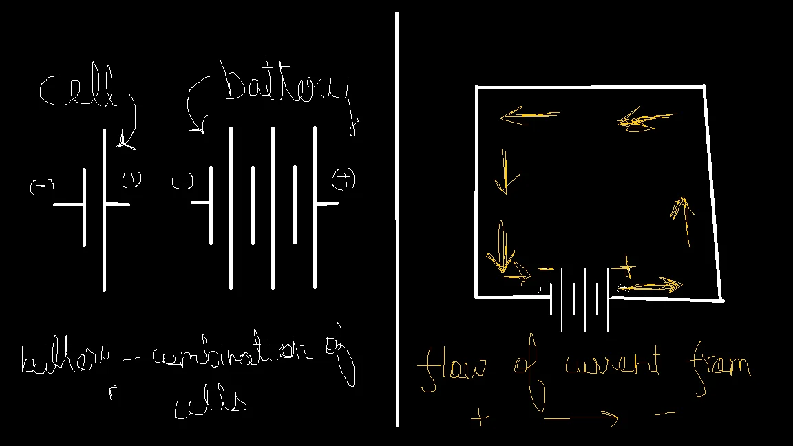In a battery symbol, the longer side represents the positive terminal, while the shorter side represents the negative terminal. What are these terminals? Remember when we discussed the direction of water flow in relation to the pump? The same concept applies here. The terminals indicate the direction of current flow—current always flows from the positive terminal to the negative terminal. (For those wondering about charge movement and terminal polarities, don’t worry! We’ll clarify this in upcoming articles.)